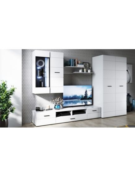 Оригинальная и сдержанная стенка легко впишется в интерьер вашей гостиной. Лаконичный дизайн, строгие линии и максимальная функциональность. Теперь ваша гостиная станет более эргономичной и комфортабельной.Модель произведена из качественных материалов. Корпус и фасады изготовлены из ЛДСП в сочетании с закаленным стеклом. В комплектацию входит: тумба под телевизор с открытыми и закрытыми нишами и два шкафа- витрины со съемными полками, один навесной, один напольного расположения. Соединяет всю конструкцию в верхней части просторная, открытая полка, на ней можно хранить элементы декора. Комфорта в использовании добавляют элегантные ручки. Лоска изделию добавляет эффектное сочетание глянцевых и стеклянных фасадов.