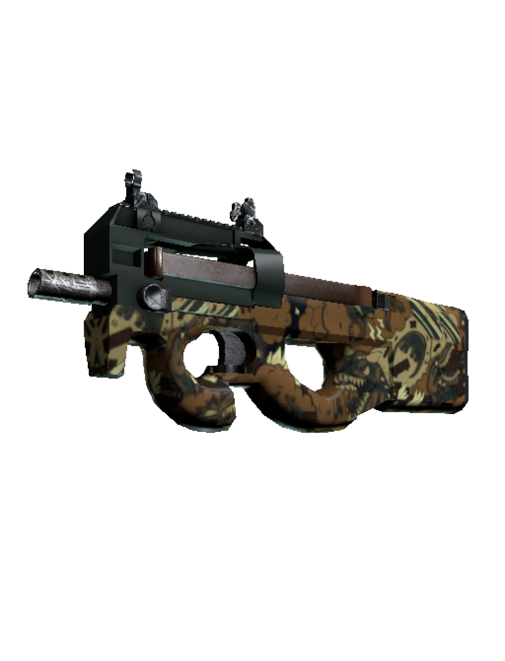 The P90 is easily recognizable by its unique bullpup design. This weapon is great for shooting on the move thanks to its high magazine capacity and low recoil. An olive and gold hydrographic is applied with a cartoon dinosaur pattern. Here and dinosaurs, and aliens, and comets! Wow! Float: 0.125486 Type: SMG Rarity: Mil Spec Grade Exterior: Minimal Wear