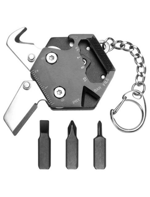 • нож, линейка, открывалка для бутылок, плоская отвертка (средняя), пилка для ногтей, держатель для малых бит, режущий крюк, напильник по дереву / металлу, крестовая отвертка (PZ), гаечный ключ, зачистной резак, отвертка с широким шлицем, карабин, крестообр