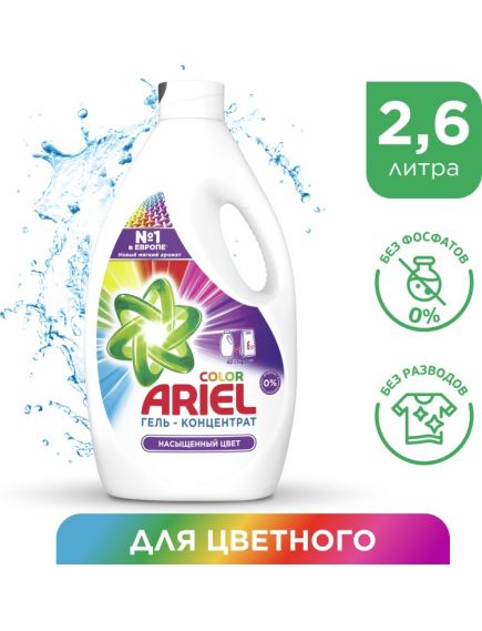 Жидкий Гель - концентрат Ariel Color для цветного белья - превосходно и бережно отстирывает загрязнения на одежде и белье, сохраняя их яркость и цвет. В отличие от обычного порошка, Ariel-гель сразу попадает в барабан стиральной машины, и быстро растворяется в воде. Он эффективен на коротких циклах стирки и беспощадно удаляет пятна и грязь, вызывающие неприятные запахи, придавая одежде сияющую чистоту и приятный аромат свежести. 'Противопоказания Меры предосторожности: Беречь от детей. Избегать попадания в глаза. При попадании в глаза - немедленно промыть проточной водой. Не глотать. При проглатывании обратитесь за медицинской помощью. Вымыть руки после использования. Хранить вдали от пищевых продуктов. При повышенной чувствительности и повреждениях кожи избегать длительного контакта с любыми средствами для стирки.'