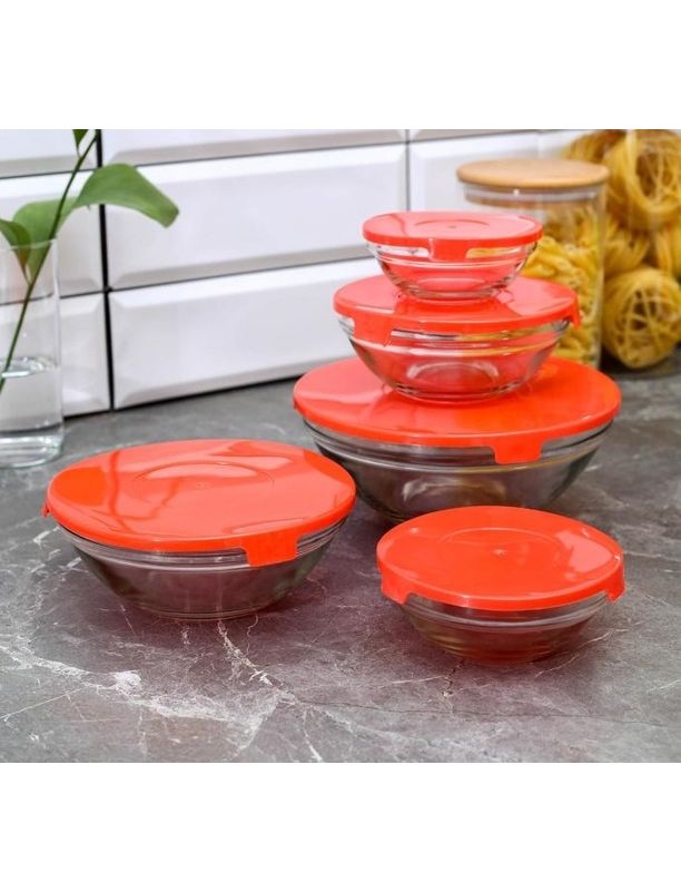 - Набор салатников Доляна «Классика» с крышками, 5 шт: 900 мл (17х7,6 см), 500 мл (16х6 см), 350 мл (12,5х5,4 см), 200 мл (10,5х4,5 см), 130 мл (9х3,7 см)